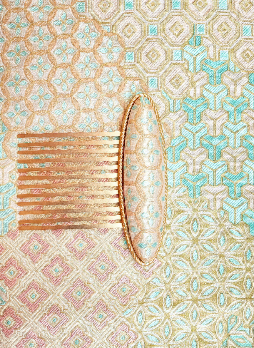 En håndlaget hårkam av ekte silke med et geometrisk mønster i gyllent, lysblått og rosenrosa.