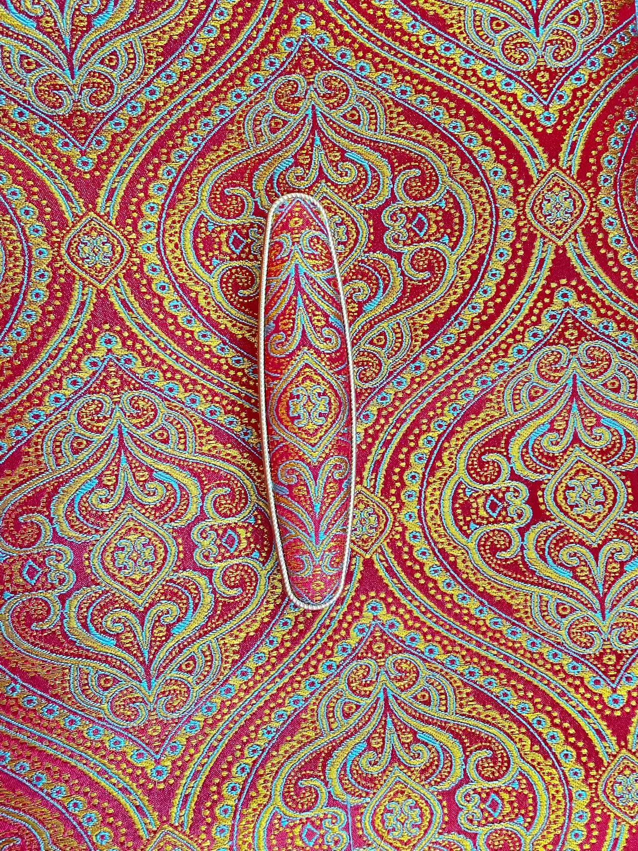 Denne elegante hårklemmen er håndlaget av ekte silke, inspirert av tradisjonelle norske bunadmønstre. De dype røde, gylne og blå tonene symboliserer rik kulturarv og tidløs skjønnhet. Perfekt som et raffinert tilbehør til bunad, festdrakt eller som et eksklusivt element i hverdagsantrekket.
